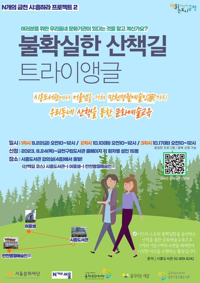 [시민일보 = 여영준 기자] 금천문화재단 금천구립시흥도서관은 오는 9월22일부터 지역주민을 대상으로 한 문화 예술교육프로그램 ‘불확실한 산책길: 트라이앵글’을 운영한다고 밝혔다.