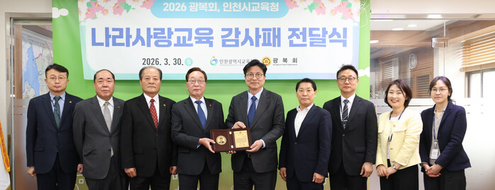 [인천=문찬식 기자] 인천시교육청(교육감 도성훈)은 지난 30일, 그동안 추진해 온 ‘역사 바로 알기’ 교육 정책과 독립운동 정신 계승을 위한 다양한 교육활동의 성과를 인정받아 광복회로부터 감사패를 받았다.