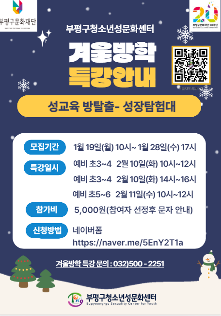 [인천=문찬식 기자] 인천 부평구 청소년성문화센터는 겨울방학을 맞아 초등학생을 대상으로 한 참여형 성교육 프로그램 ‘성교육 방탈출 게임–성장탐험대’ 겨울방학 특강을 오는 2월 10일~11일 양일간 운영한다.