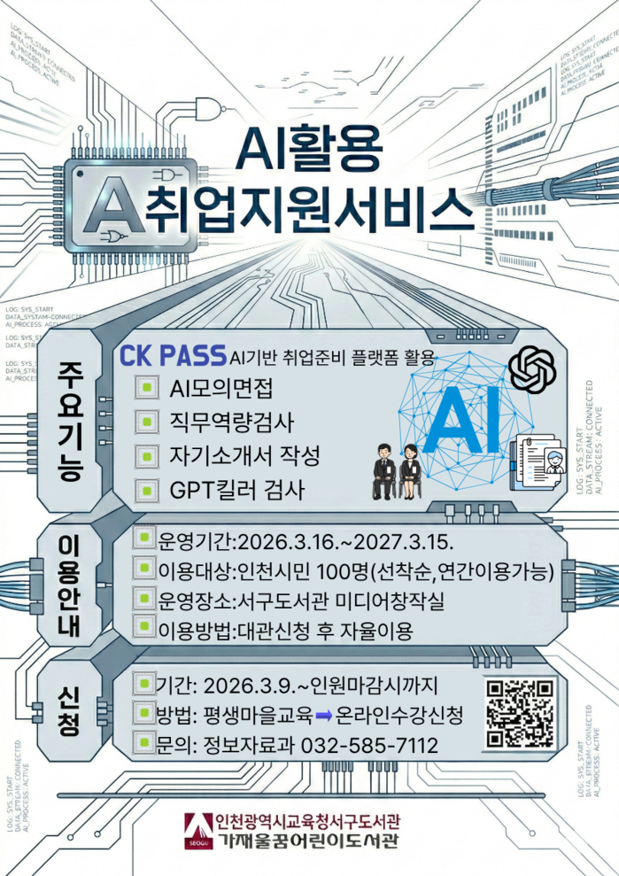 [인천=문찬식 기자] 인천광역시교육청서구도서관(관장 정연순)은 최근 급변하는 채용 트렌드에 맞춰 취업을 준비하는 시민에게 실질적인 도움을 주고자, 16일부터 ‘2026 AI 활용 취업지원 서비스’를 운영한다.
