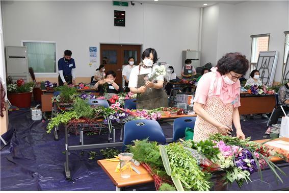 | ▲ 화훼장식 종목에 참가한 장애인 선수들이 꽃꽂이를 만들기위해 재료를 다듬고 있다.(출처=전남한국장애인고용안정협회 전남지부) |