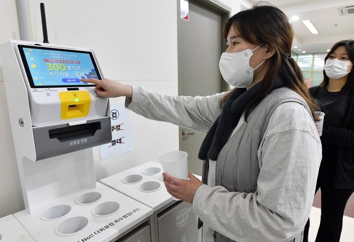 | ▲ 구 직원들이 구청 내 설치된 다회용컵 무인 반납기를 이용하고 있는 모습. (사진=노원구청 제공) |