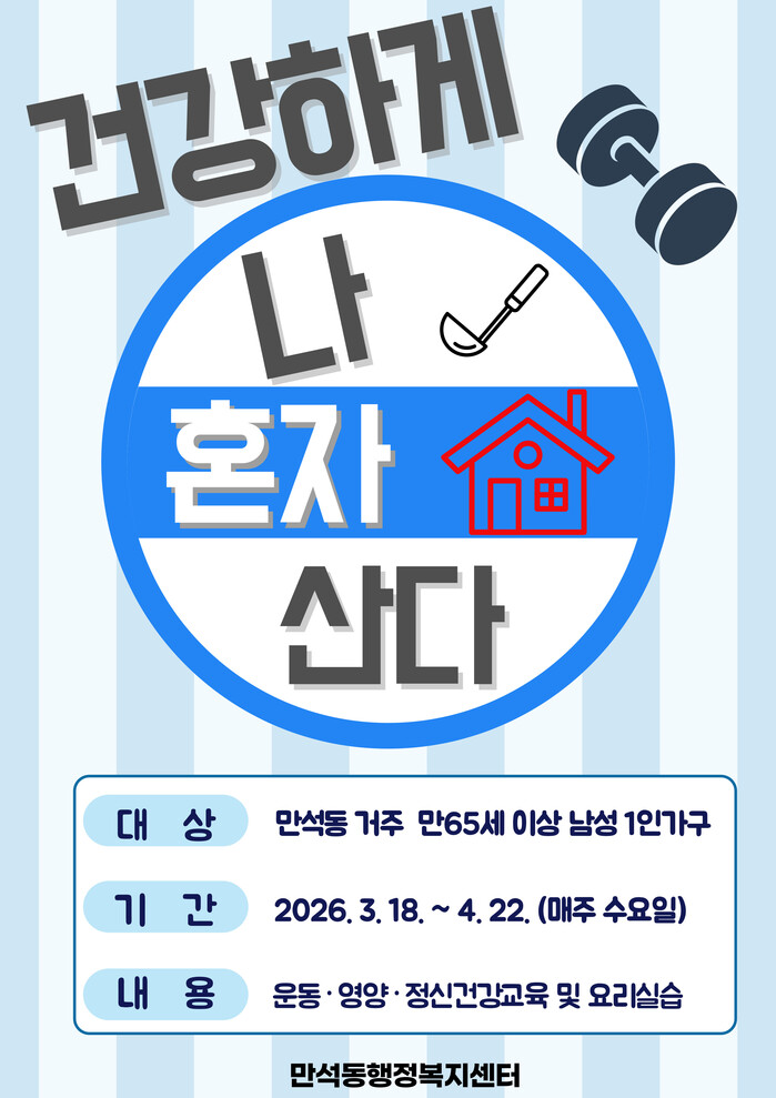 남성1인 가구를 대상으로 진행되는‘건강하게 나 혼자 산다’사업은 3월18일~4월22일까지 전문 강사를 초빙하여 총 6차례 걸쳐 맞춤형 운동·영양 교육을 실시하고 만성질환 예방 건강 요리 실습 3회, 1인 가구 자살예방 교육 등을 참여자들에게 제공한다.