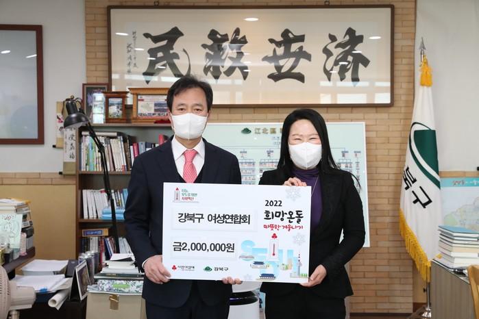 서울 강북구는 최근 강북구여성연합회로부터 설을 맞아 회원들이 지역내 소외된 이웃을 위해 십시일반으로 모은 따뜻한 겨울나기 성금 200만원을 기부받았다. 사진은 전달식에서 박겸수 구청장(왼쪽)과 박희원 회장이 기념촬영을 하고 있는 모습. (사진제공=강북구청)