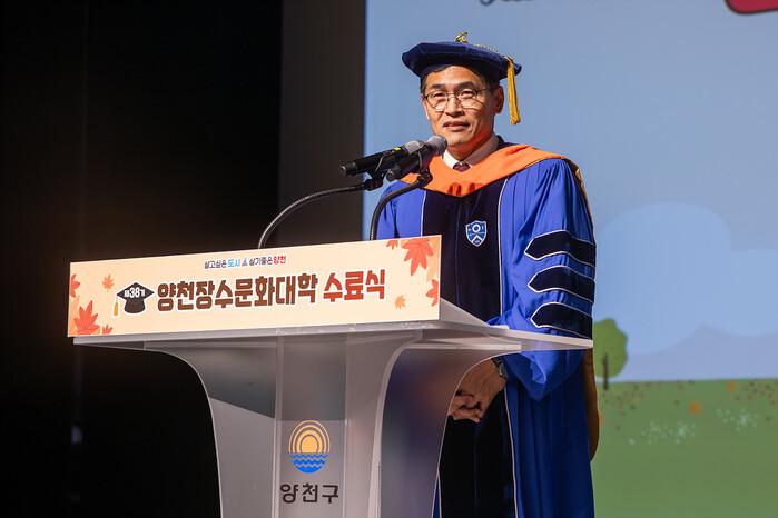 | ▲ ‘제38기 장수문화대학 수료식’에서 이기재 구청장이 축하 인사말을 전하고 있다. (사진=양천구청 제공) |