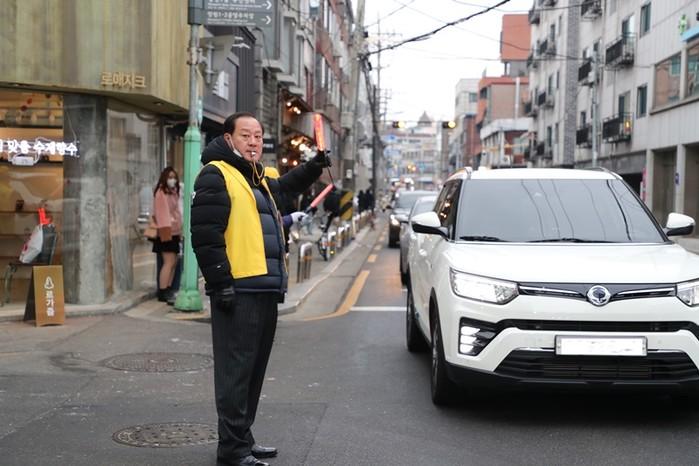 유동균 서울 마포구청장이 최근 망원1-2 공영주차장 앞 도로 교통정리 봉사에 나섰다. 이곳은 주말이 되면 망원시장과 망리단길을 방문하는 시민들로 진출입로 혼잡도가 높아 주민 민원이 많이 제기되고 있다. 사진은 망원1-2 공영주차장 앞 도로 교통정리 봉사에 나선 유 구청장의 모습. (사진제공=마포구청)