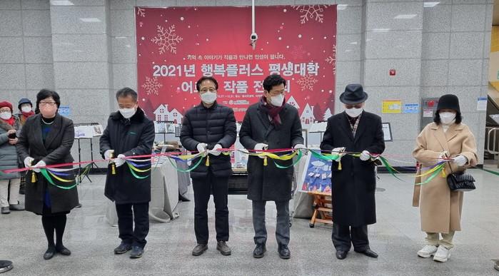 경기 남양주시 해피누리노인복지관은 최근 평내호평역에서 ‘2021년 행복플러스평생대학 어르신 작품 전시회’ 오프닝 행사를 개최했다. 전시회에는 행복플러스평생대학 사진반의 인생자서전-포토북과 퀼트, 마크라메 등 문화예술이음터반의 공예품들이 출품됐다. 사진은 이날 전시회 관계자들이 테이프 커팅을 하는 모습. (사진제공=남양주시청)