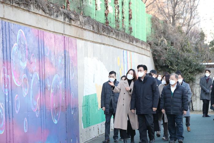 서울 송파구는 최근 ‘송파둘레길 시즌2’ 사업으로 성내천 구간에 자리한 오륜초등학교 옹벽 90m 구간에 ‘어린이와 놀이’를 주제로 한 ‘동심(童心)벽화’를 조성했다. 사진은 박성수 구청장(앞 오른쪽)이 동심벽화를 만든 김진오 작가에게 작품설명을 듣고 있다. (사진제공=송파구청)