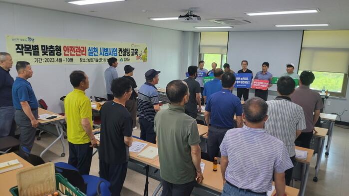 지난 8월 17일 시범사업 대상인 함양사과연구회 회원 30명이 참여한 가운데 농작업 안전캠페인 결의문 낭독과 함께 농작업 안전리더 교육을 진행했다.