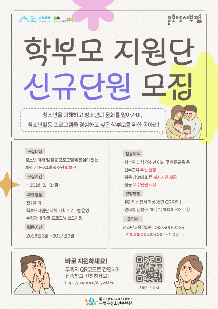 [인천=문찬식 기자] 인천 부평구 청소년수련관은 오는 3월 13일까지 2026년 제7기 학부모지원단 ‘데이트’의 신규 단원을 모집한다고 밝혔다.