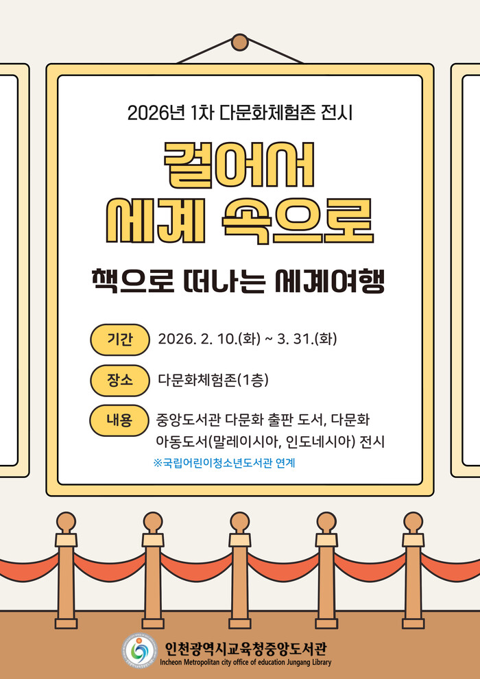 [인천=문찬식 기자] 인천광역시교육청중앙도서관(관장 임현자)은 2월 10일부터 3월 31일까지 1층 다문화체험존에서 ‘책으로 떠나는 세계여행’ 전시를 개최한다.