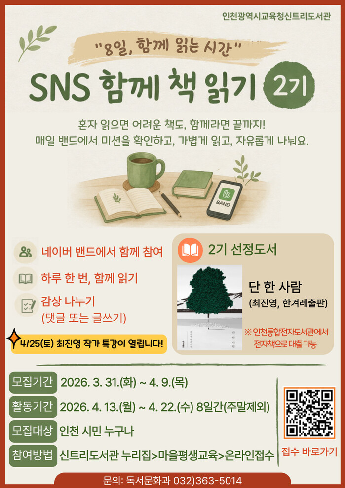 [인천=문찬식 기자] 인천광역시교육청신트리도서관(관장 정경애)은 시민의 일상 속 독서 활성화를 위하여, 3월 31일부터 온라인 참여형 독서 프로그램 ‘SNS 함께 책 읽기’ 2기 참여자를 모집한다.