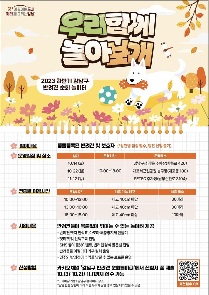 [시민일보 = 이대우 기자] 강남구(구청장 조성명)가 ‘하반기 반려견 순회놀이터’를 3회에 걸쳐 무료 운영한다.