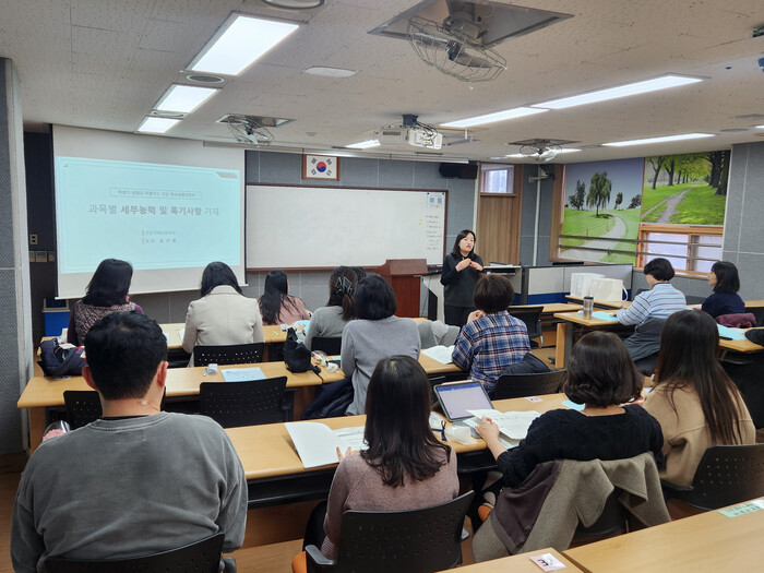 이번 연수는 순회교사들이 변화하는 대입 제도에 발맞춰 학교생활기록부 기재 전문성을 갖추고, 고교학점제 기반의 수업 역량을 높일 수 있도록 이론 강의와 분임 토의 형식으로 진행했다.