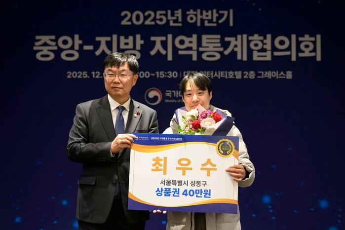 [시민일보 = 박소진 기자] 성동구(구청장 정원오)는 국가데이터처가 주관한 ‘2025년 지역통계 우수사례 공모전’에서 최우수상을 수상했다고 밝혔다.