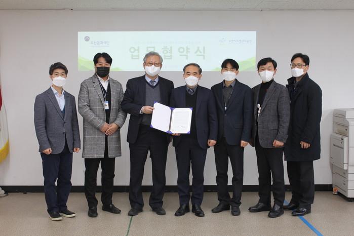 경기 오산문화재단은 오산시시설관리공단과 최근 양 기관의 교류 활성화를 위한 업무 협약을 체결했다. 협약의 주요 내용은 ▲각 사업에 필요한 시설물 활용 지원 ▲협력 사업 추진 ▲지역사회 공헌 공동 추진 등이다. 사진은 협약식에서 관계자들이 기념촬영을 하는 모습. (사진제공=오산시청)
