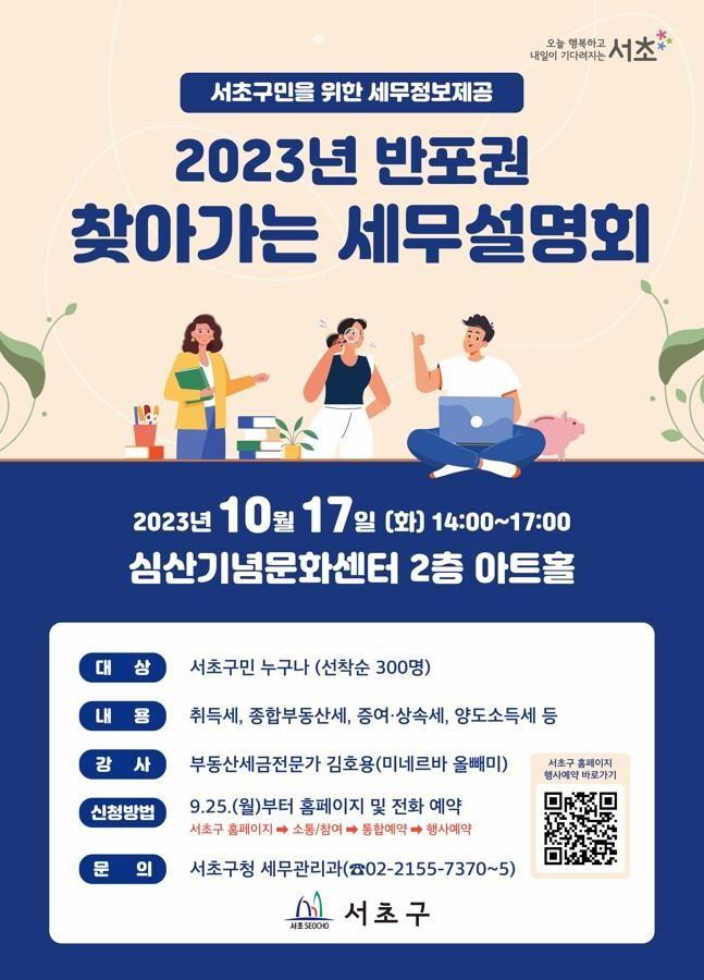 [시민일보 = 이대우 기자] 서초구(구청장 전성수)가 잦은 세법 개정으로 복잡해진 세금 관련 구민의 궁금증 해소를 위해 오는 17일 오후 2시 심산기념문화센터에서 ‘2023년 반포권, 찾아가는 세무설명회’를 개최한다.