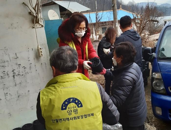경기 양평군 단월면지역사회보장협의체는 29일 저소득 노인가구의 따뜻한 겨울나기를 위해 양평군 희망나누미에서 기부한 연탄 500장 나눔봉사를 실시했다. 사진은 이날 봉사자들이 대상가구에 연탄을 배달하고 있는 모습. (사진제공=양평군청)