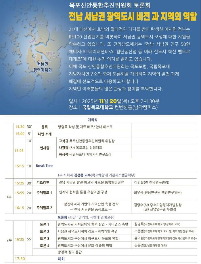 이번 토론회는 목포시와 신안군을 비롯한 서남권 50만 광역도시 구축을 위한 전략과 협력 모델을 모색하기 위해 마련된 것으로, 미래 신산업·도시계획·문화 발전 등 주요 과제를 종합적으로 논의하며 서남권의 비전과 역할에 대한 구체적 방향을 공유하는 자리다.