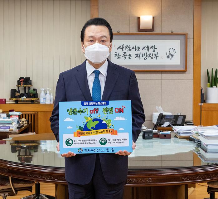 노현송 서울 강서구청장이 지난 8일 에너지효율 1등급 제품 우선 구매 등 일상생활 속 에너지 절약을 통해 환경위기를 극복하자는 ‘생활속 에너지 절약 챌린지’에 동참하며, 에너지 절약 운동에 구민들의 적극적인 참여를 호소했다. 사진은 노 구청장이 전기절약 방법 문구가 적힌 손팻말을 들어보이며 챌린지에 참여하고 있는 모습. (사진제공=강서구청)