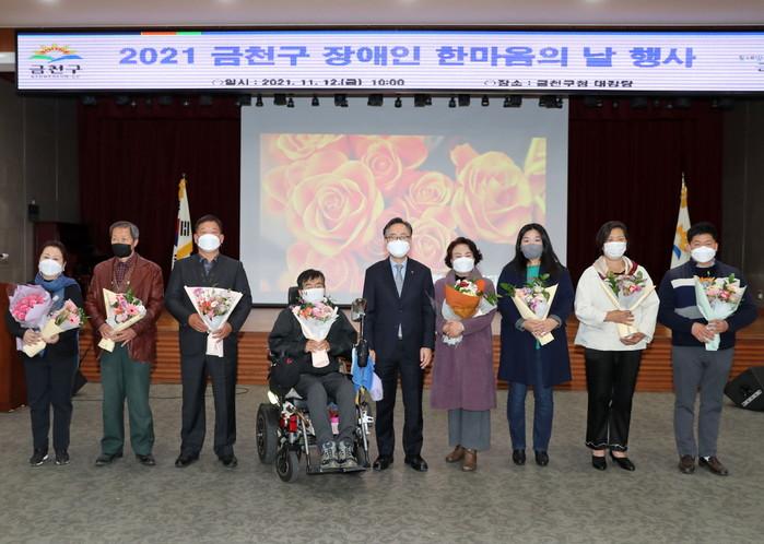 서울 금천구는 최근 제41회 장애인의 날을 기념하고 장애인과 비장애인의 화합을 위해 ‘금천 장애인 한마음의 날 기념식’을 개최했다. 기념식에서는 장애인 권익증진을 위해 노력한 분들에 대한 감사패와 표창 수여도 진행됐다. 사진은 기념식에서 유성훈 구청장(가운데)이 유공자와 기념촬영을 하고 있는 모습. (사진제공=금천구청)