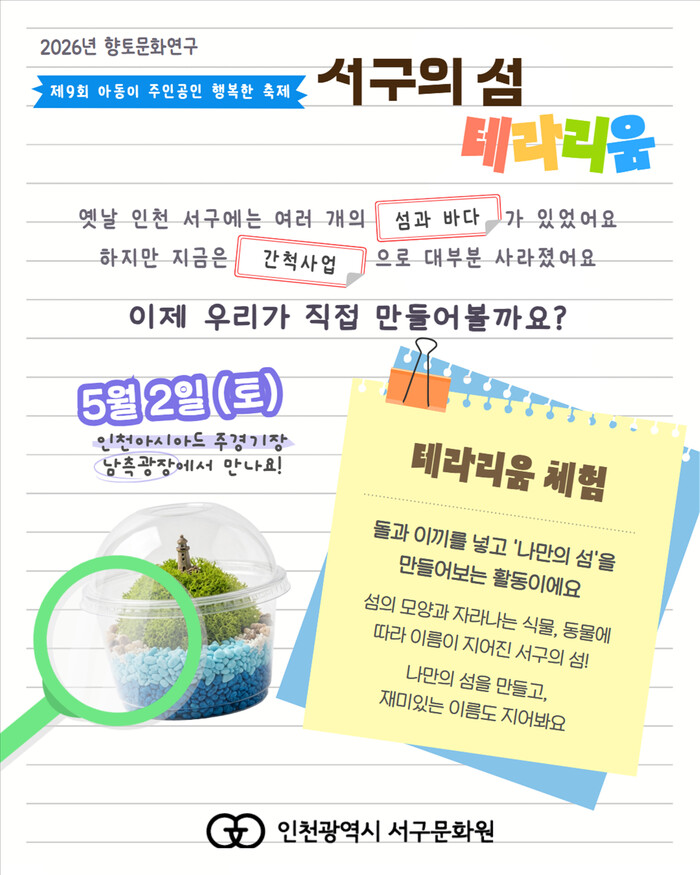 [인천=문찬식 기자] 인천 서구문화원(원장 원부희)은 오는 5월2일 인천아시아드주경기장 남측광장에서 열리는 제9회 아동이 주인공인 행복한 축제’에서 ‘서구의 섬, 테라리움 만들기’ 체험 부스를 운영한다고 밝혔다.