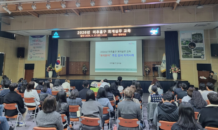 이번 교육은 계약 업무의 청렴성을 높이고, 지적 사례의 사전 예방, 내부통제 수준 향상을 위해 마련됐으며 ‘2026년 미추홀구 회계실무 교육’과 병행해 진행됐다.
