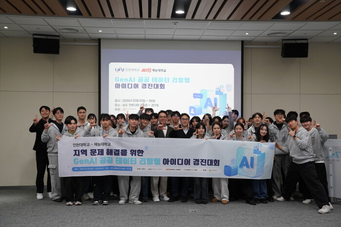 | ‘GenAI 기반 공공데이터 리빙랩 아이디어 경진대회’참가자들이 포즈를 취하고 있다. [사진=인천대] |