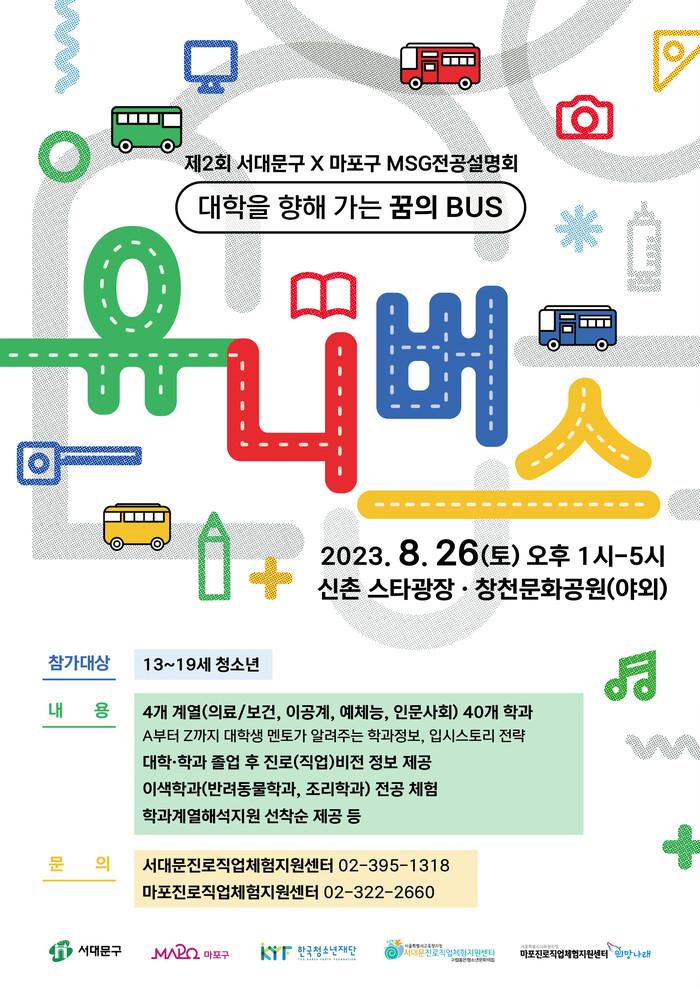 [시민일보 = 홍덕표 기자] 서대문구(구청장 이성헌)와 서대문진로직업체험지원센터가 오는 26일 오후 1시부터 5시까지 신촌 스타광장과 창천문화공원에서 '제2회 서대문구X마포구 MSG 전공설명회'를 개최한다.