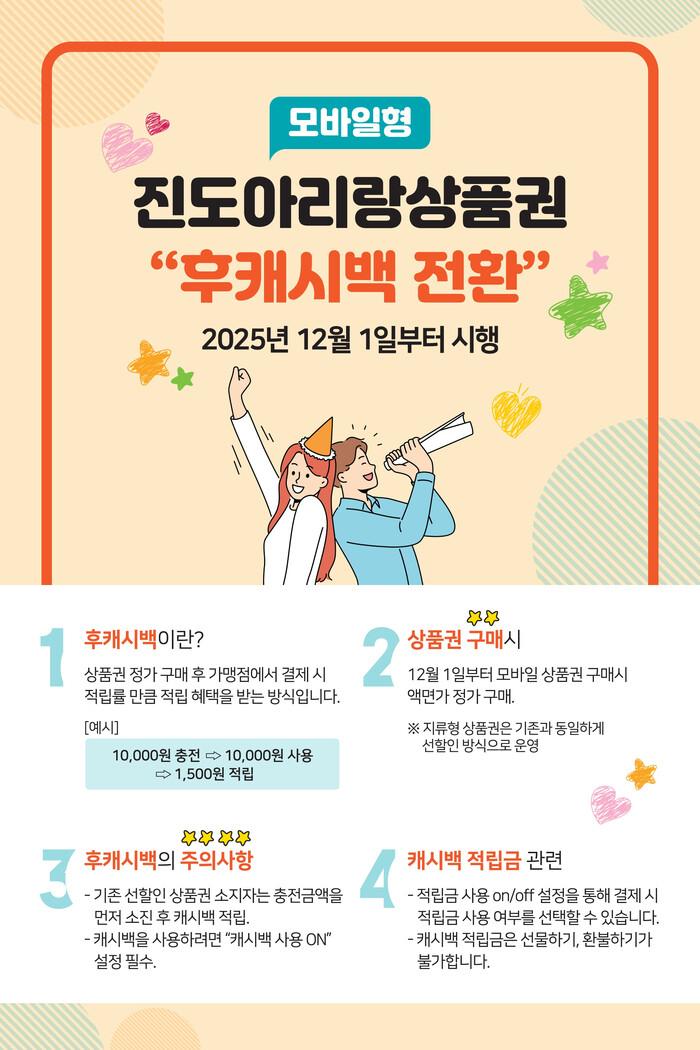 한편 지류형 진도아리랑상품권은 기존과 똑같이 ‘선할인’ 방식으로 운영되며, 현재 보유 중인 카드, 이동통신형(모바일형) 상품권 잔액은 모두 사용한 이후부터 ‘후적립(후캐시백)’ 방식이 적용된다.