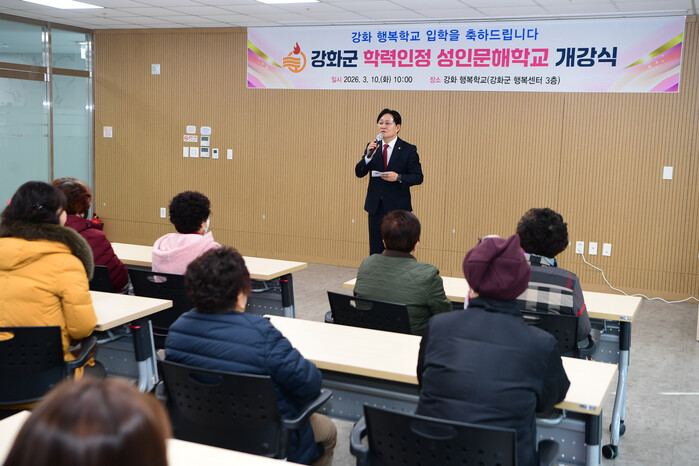 [인천=문찬식 기자] 인천 강화군(군수 박용철)은 지난 10일 강화군행복센터에서 배움의 기회를 놓친 어르신들을 위한 성인문해학교 ‘강화 행복학교’ 개강식을 개최했다. 이날 행사는 늦깎이 배움에 도전하는 어르신들을 응원하는 따뜻한 분위기 속에서 진행되며 감동을 더했다.