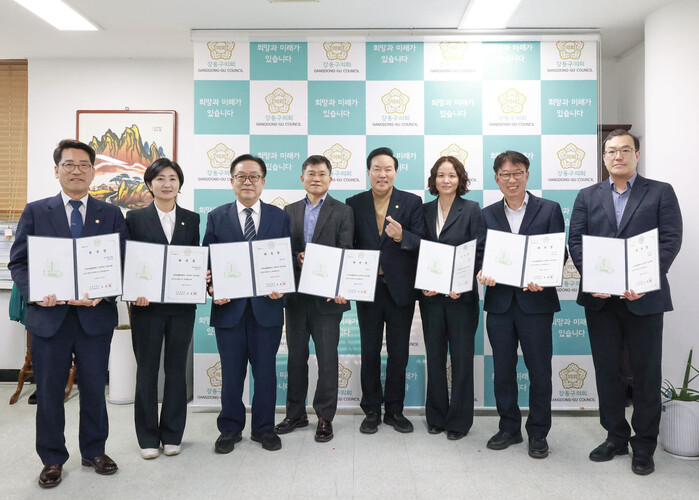 서울 강동구의회가 ‘2025회계연도 결산검사위원’ 위촉식을 열고 위촉장을 수여했다. 위원들은 오는 5월7일까지 예산 집행의 적법성과 타당성, 재정 운영의 효율성 등을 종합적으로 점검한다. 사진은 기념촬영을 하고 있는 위원들의 모습. (사진=강동구의회 제공)