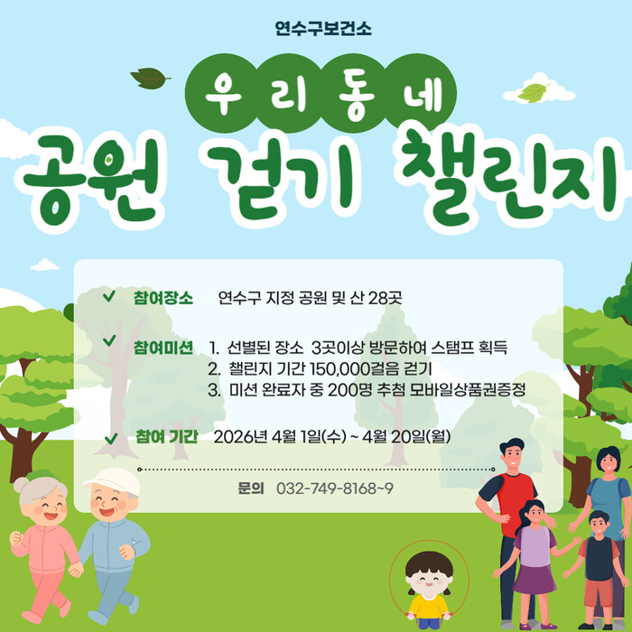 프로그램은 옥련동, 청학동, 연수동, 선학동, 동춘동, 송도동 등 관내 28개 공원과 산을 대상으로 운영되며, 참여자는 지정된 공원을 방문해 30분 이상 걷기를 실천하면 ‘스탬프’를 받을 수 있다.
