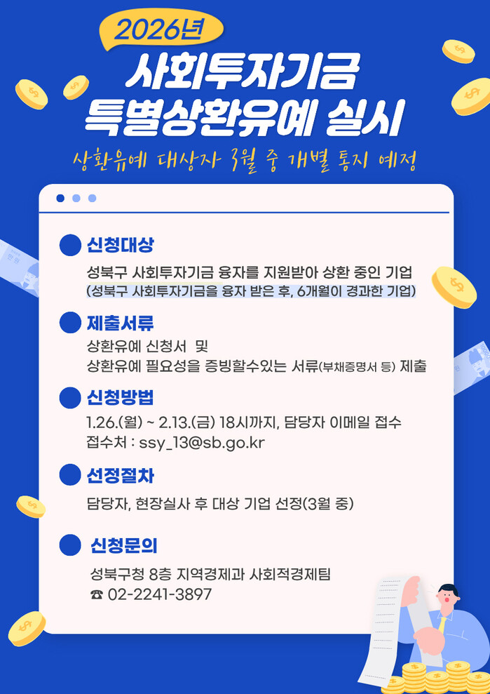 신청 기간은 오는 26일부터 2월13일까지다. 신청을 희망하는 기업은 성북구청 홈페이지에서 신청서를 내려받아 기업 부채증명서 등 상환 유예 필요성을 입증할 수 있는 서류를 첨부해 담당자 이메일로 제출하면 된다.