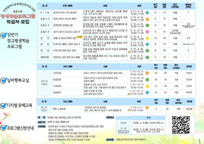 [인천=문찬식 기자] 인천광역시교육청신트리도서관(관장 정경애)은 지역 주민의 생애주기별 학습 기회 제공을 위해 2026년 상반기 평생학습프로그램 학습자를 모집한다.
