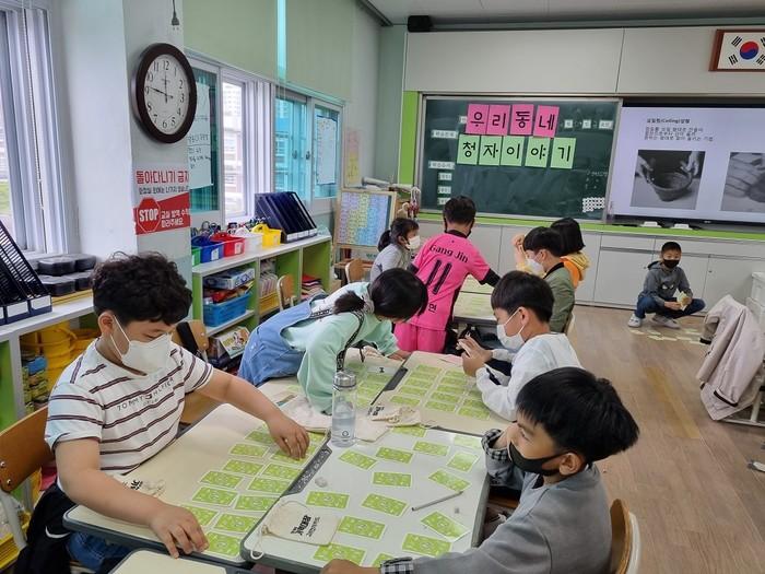 | ▲ 강진군 고려청자박물관이 관내 초등학생을 대상으로 실시한 '우리동네 청자이약기 교육프로그램인 보드게임에 참여하고 있는 강진중앙초 학생들 / 사진=강진군 제공 |