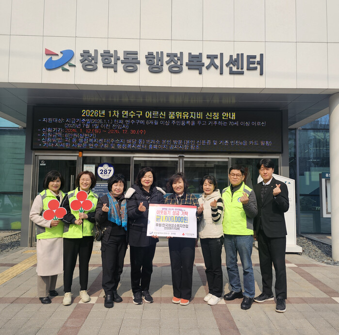 [인천=문찬식 기자] 인천 연수구 청학동지역사회보장협의체(위원장 김대진·이진희)는 지난 9일 (사)한국여성소비자연합 인천 연수구지부(회장 오은미)로부터 이웃돕기 성금 100만 원을 전달받았다.