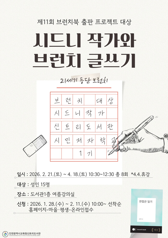 [인천=문찬식 기자] 인천광역시교육청신트리도서관(관장 정경애)은 시민의 집필 능력을 키우고 예비 작가를 발굴하기 위해 ‘브런치 대상 시드니 작가와 함께하는 브런치 글쓰기’ 프로그램 참여자를 모집한다.