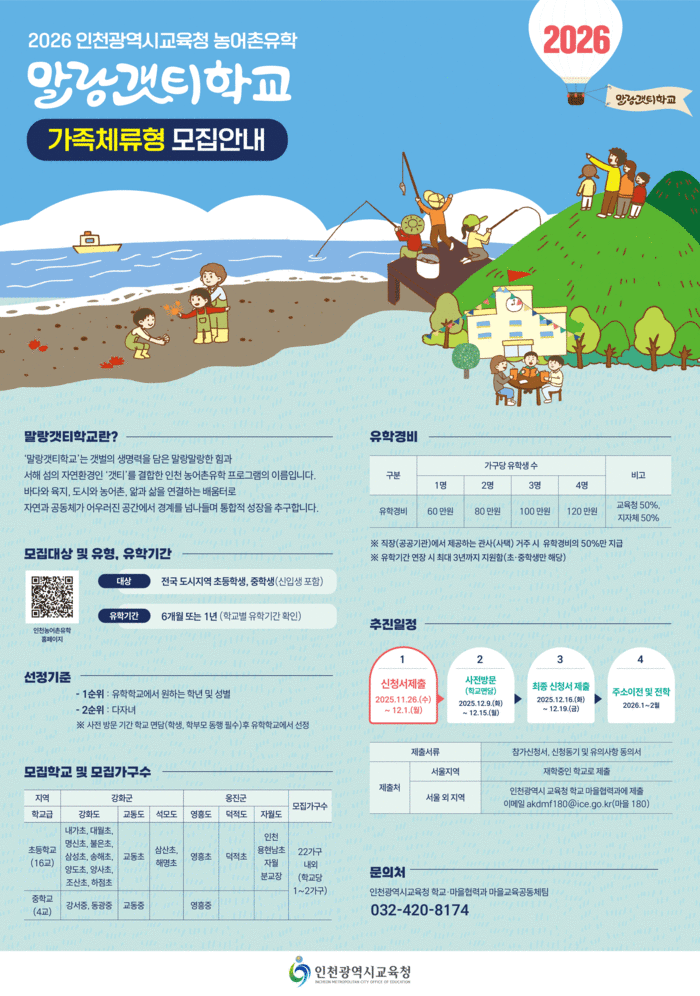 [인천=문찬식 기자] 인천광역시교육청(교육감 도성훈)은 26일부터 12월 1일까지 강화군과 옹진군 내 20개 초·중학교에서 2026학년도 농어촌유학생을 모집한다.