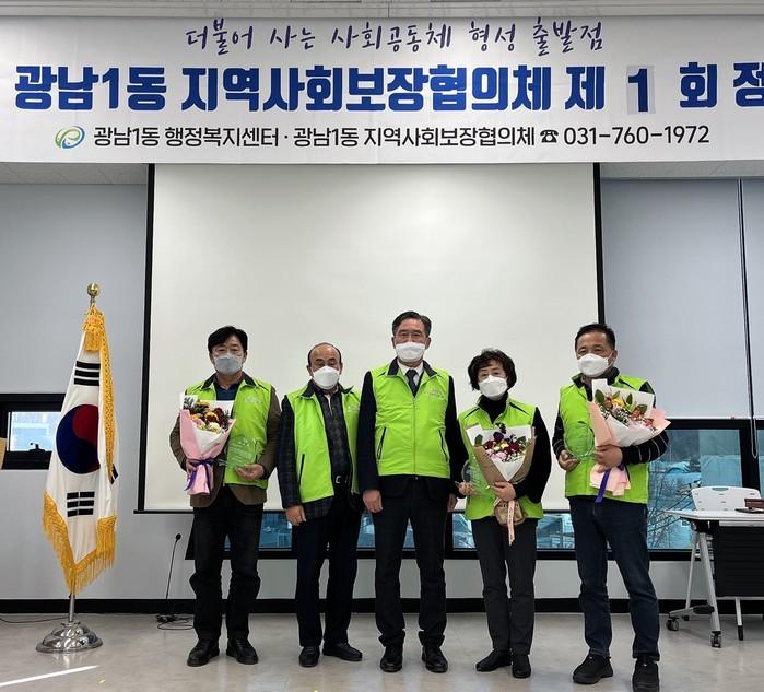 경기 광주시 광남1동 지역사회보장협의체는 최근 ‘2022년 제1회 정기회의’를 개최해 임기 만료 위원에 공로패 수여, 신규위원 위촉장 전수, 지역사회보장협의체 활성화 유공에 대한 도지사 표창장 전수식 등을 진행했다. 사진은 이날 선출된 제4기 민간위원장 및 관계자들이 기념촬영을 하는 모습. (사진제공=광주시청)