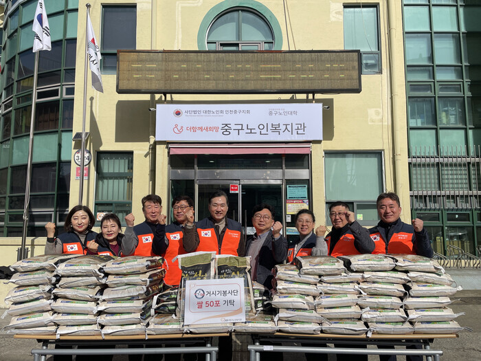 [인천=문찬식 기자] 인천중구노인복지관(관장 김세원)은 민족의 명절 설을 앞두고 ‘거시기봉사단(회장 윤경원)’으로부터 쌀 50포를 기탁받았다고 밝혔다.