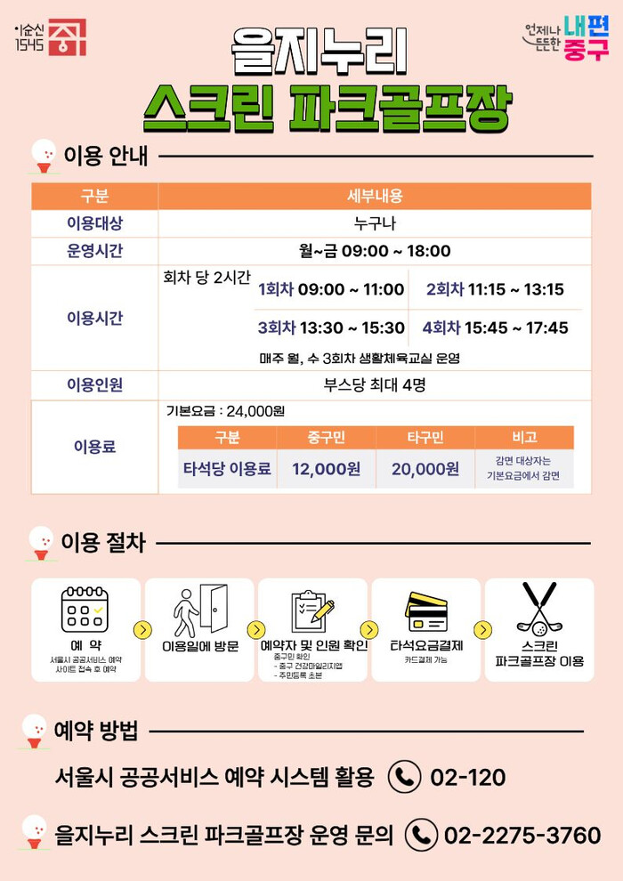 이용료는 타석당 중구민 1만 2천 원, 타 구민 2만 원이다. 현장에서 신분증을 맡기면 골프채를 무료로 대여할 수 있어, 별도의 장비 준비 없이도 누구나 가볍게 방문해 즐길 수 있다.