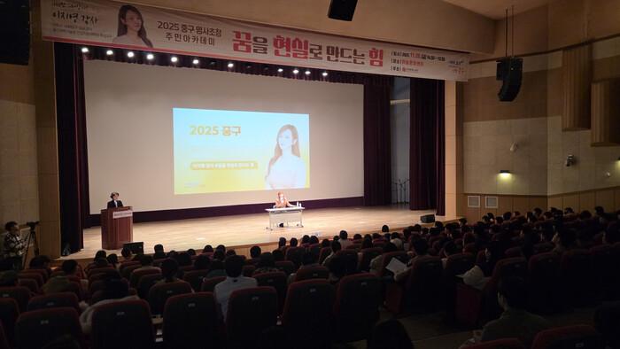 [인천=문찬식 기자] 인천 중구(구청장 김정헌)는 ‘사회탐구 영역 일타강사’로 유명한 이지영 씨를 초청해 ‘2025 하반기 중구 명사 초청 주민아카데미’를 성황리에 개최했다고 밝혔다.