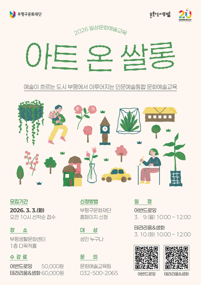 재단 관계자는 “부평구문화재단이 출범 20주년이 된 만큼, 부평만의 색깔이 담긴 내실 있는 교육으로 시민들이 일상에서 예술을 체감할 수 있도록 하겠다”고 전했다.