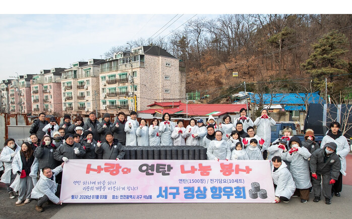 이날 행사에서는 서구경상향우회와 야단법석봉사단에서 준비한 연탄 1,500장을 자원봉사자 30여 명이 석남3동 26통에 전달하며 한파 속에서 따뜻한 나눔의 시간을 가졌다.