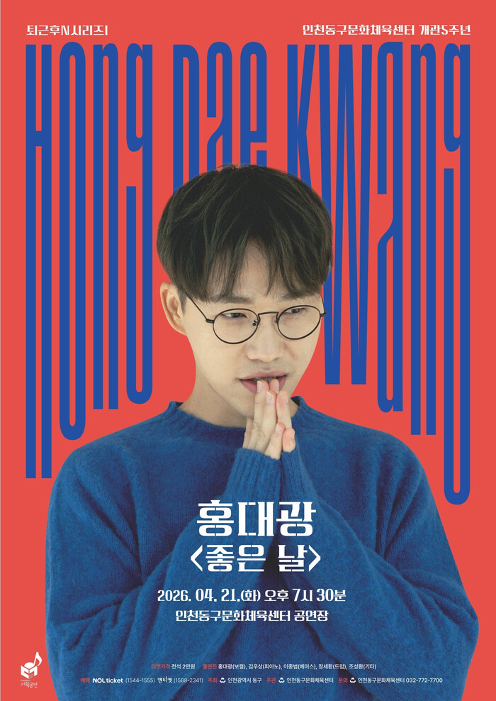 [인천=문찬식 기자] 인천동구문화체육센터는 업무에 지친 직장인을 대상으로 오는 21일 오후 7시30분 홍대광의 <좋은 날> 공연을 개최한다고 밝혔다.