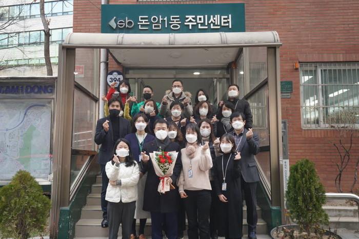 이승로 서울 성북구청장이 지난 4일 신년을 맞아 삼선동을 시작으로 양일간 성북구 20개 전동을 방문해 코로나19 대응 최일선 현장에서 근무하는 동주민센터 직원들을 만나 격려했다. 사진은 5일 이 구청장(앞줄 왼쪽 두 번째)이 돈암1동 직원들과 새해인사를 나누고 기념촬영을 하고 있는 모습. (사진제공=성북구청)