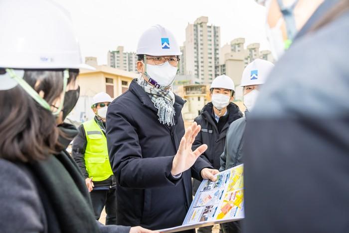 박성수 서울 송파구청장은 5일 ‘옛 성동구치소 개발사업 부지’를 방문해 개발사업 관련 주요 현안사항을 확인했다. ‘옛 성동구치소 개발사업 부지’는 대지 면적 7만8758.2㎡의 대규모 개발사업 지역이며, 오금역으로부터 도보 2분 거리의 역세권에 위치하고 있어 교통 접근성이 뛰어난 지역이다. 사진은 박 구청장(가운데)이 서울주택도시공사 등 관계자들과 대화를 하고 있는 모습. (사진제공=송파구청)