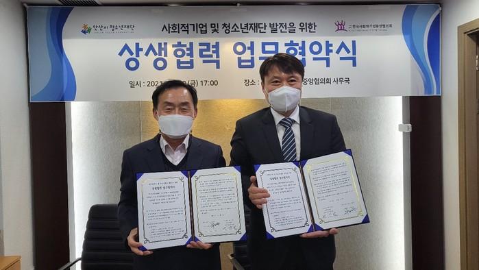 경기 (재)안산시청소년재단은 최근 한국사회적기업중앙협의회와 유기적인 업무 협력체계를 바탕으로 혁신성장 등을 위한 사업모델을 발굴하기 위한 업무협약을 체결했다. 협약으로 양 기관은 사회적기업 교육·홍보 등 협력기반을 조성하고 사업안내 등에 협력하기로 했다. 사진은 협약식에서 관계자들이 기념촬영을 하는 모습. (사진제공=안산시청)