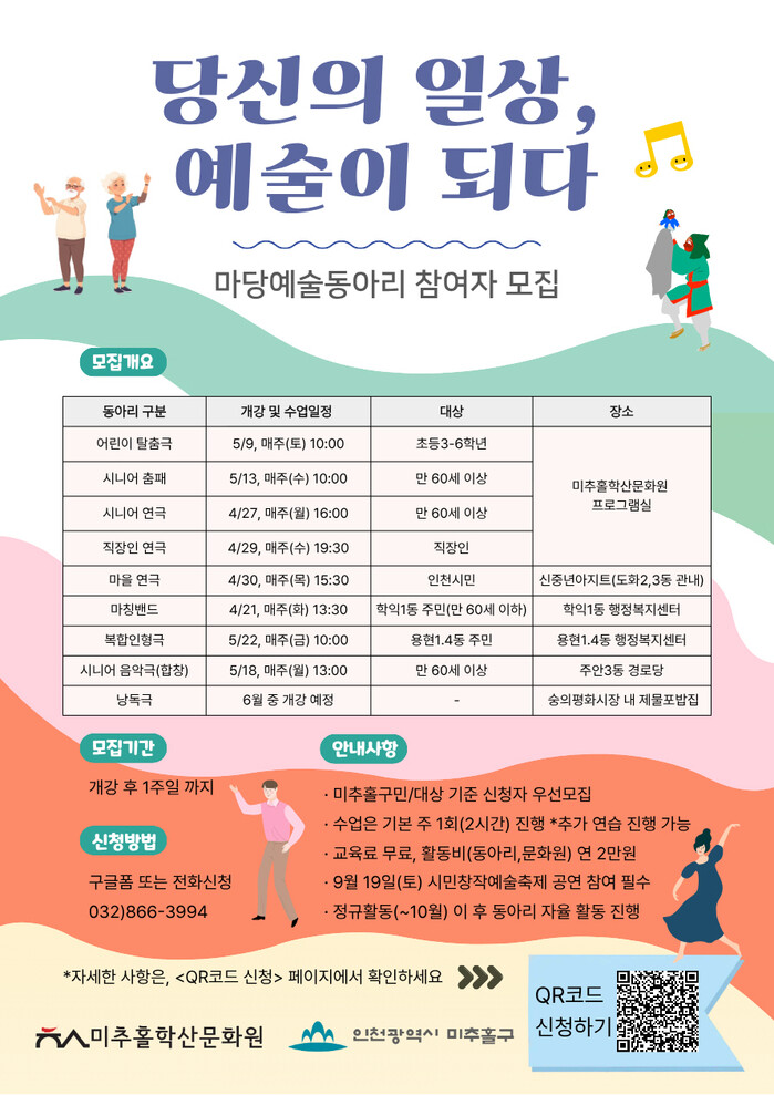 [인천=문찬식 기자] 인천 미추홀구(구청장 이영훈) 미추홀 학산문화원은 우리 이웃의 삶과 마을 이야기를 예술로 풀어낼 ‘2026 마당 예술 동아리’와 함께 할 시민들을 모집한다.